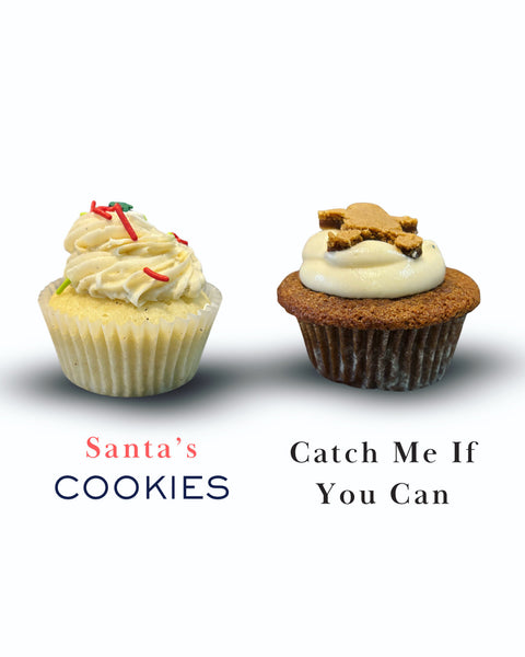 Santa’s Cookies + Catch Me If You Can: Santa’s Cookies (TThSaSu): A vanilla cupcake filled with homemade sugar cookie dough and topped with a sugar cookie buttercream frosting. Catch Me If You Can (MWF): A gingerbread cupcake with cream cheese frosting topped with a homemade gingerbread cookie.